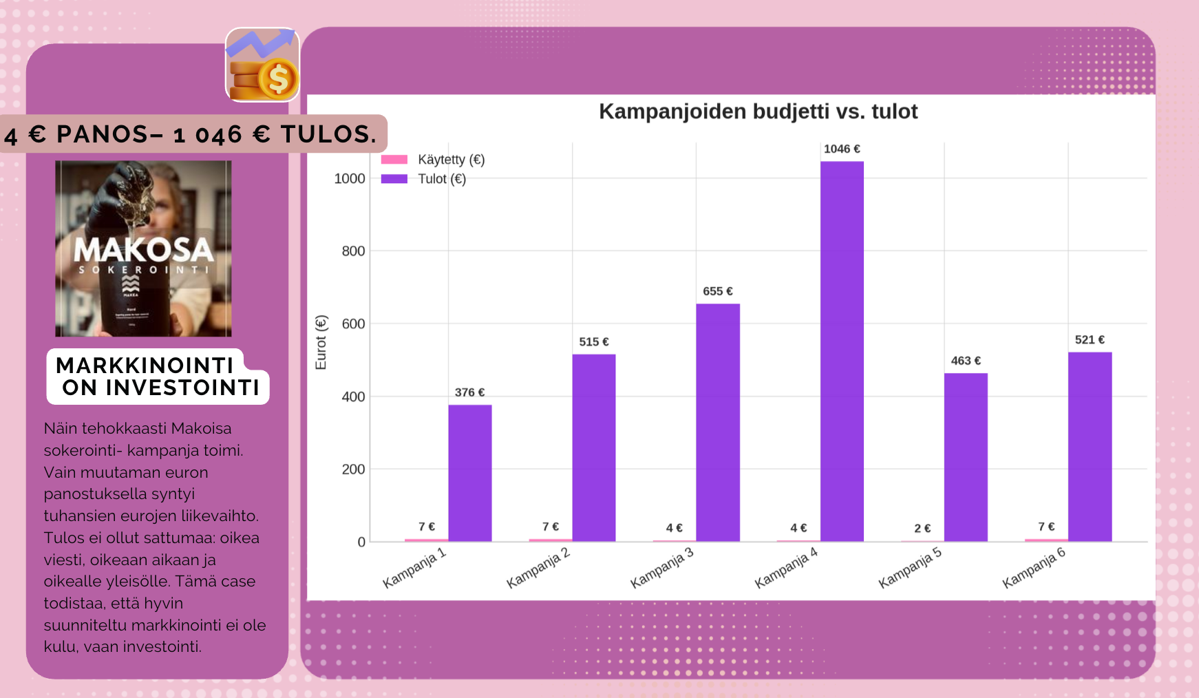 Makosa Sokeroinnin kampanjat osoittavat, miten jo muutaman euron panostuksella voidaan saada aikaan satojen eurojen lisätuloja – parhaimmillaan 4 € panos toi yli 1 000 € tuottoa.